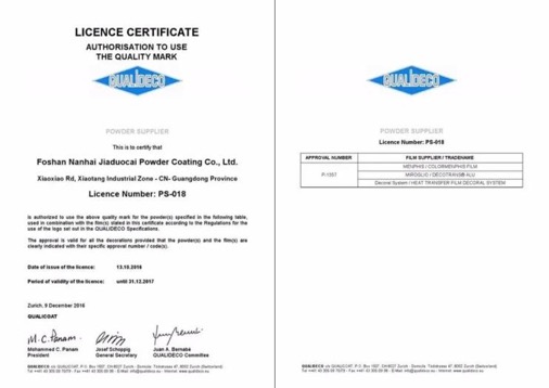 JIADUOCAI Outdoor-Specific Powder Coatings include Series A* and S* products, which comply with HG/T 2006-2006, GB/T 5237.4, and Qualicoat standards, making them suitable for outdoor applications.